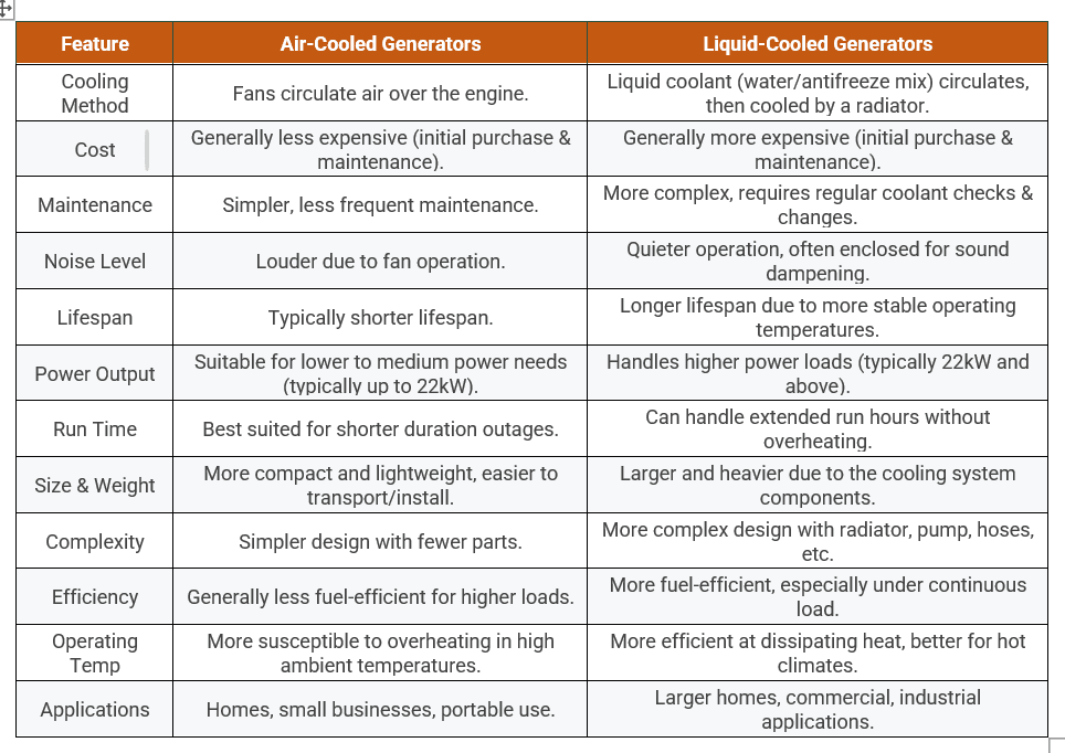 Liquid-cooled generators use a closed-loop system with a radiator that helps manage engine heat. The coolant liquid circulates, absorbs heat, and is cooled by a fan, allowing the generator to handle larger loads while maintaining stable temperatures, even in extreme conditions.